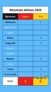 🏐 Beach soccer • 🏃 Athlétisme • 🎾 Tennis •🏊 Natation (relais) • 🧗 Longe côte •🚣 Rameur sur ergomètre • 🏉 Rugby
