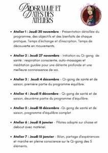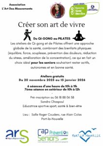 Les ateliers de Qi-Gong et de Pilates offrent une approche globale de la santé, combinant des bienfaits physiques (équilibre, force, souplesse, prévention des douleurs, réduction du stresse, amélioration de la concentration) ce qui en fait un choix idéal pour les seniors souhaitant rester actifs, autonomes et en bonne santé: téléchargez le programme