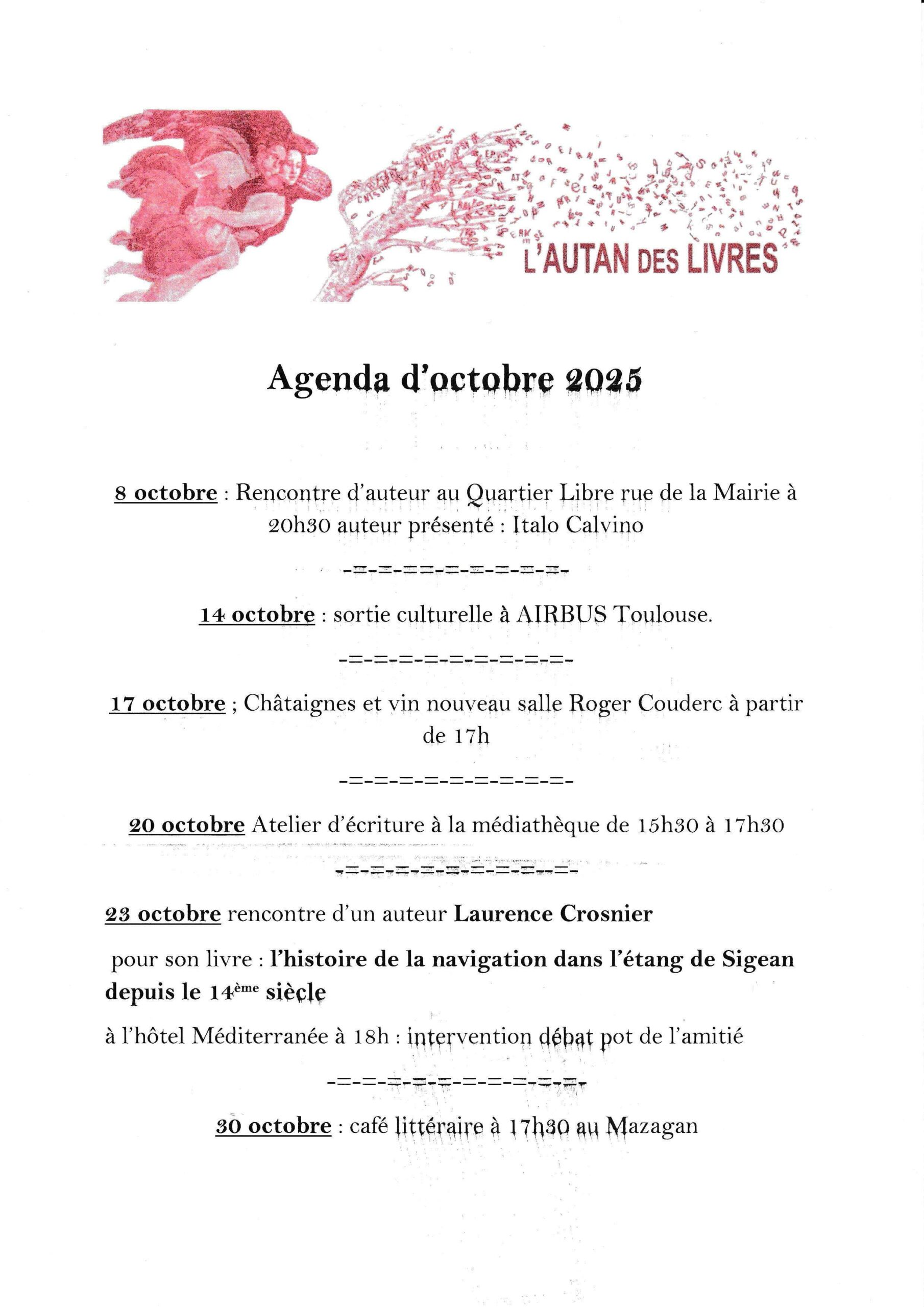 8 octobre : Rencontre d'auteur au Quartier Libre, rue de la Mairie à 20h30 // auteur présenté : Italo Calvino 17 octobre : Châtaignes et vin nouveau, salle Roger Couderc à partir 17h 20 octobre : Atelier d'écriture à la médiathèque de 15h30 à 17h30 23 octobre : rencontre d'un auteur Laurence Crosnier pour son […]
