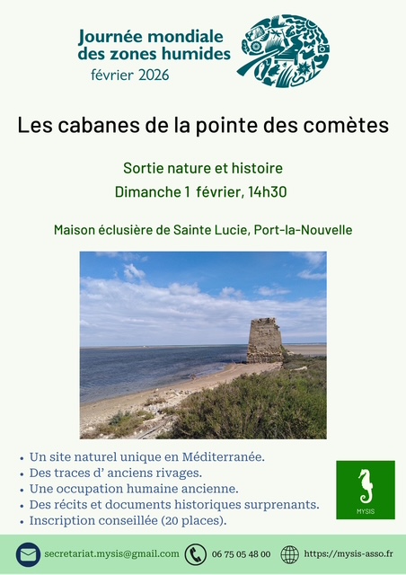 Dans le cadre des journées mondiales des zones humides, l’association Mysis propose une sortie historique et naturaliste à la pointe des comètes sur l’étang de l’Ayrolle.